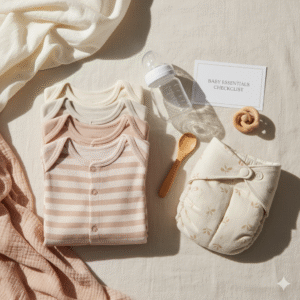 This 25-item newborn checklist focuses on essentials that are safe, practical, and recommended for the first 0–6 months. You can download a printable version at the end of this post to use for your registry or shopping list.